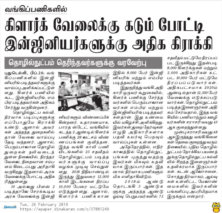 வங்கிப் பணிகளில் கிளார்க் வேலைக்கு கடும் போட்டி